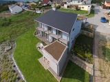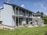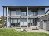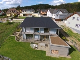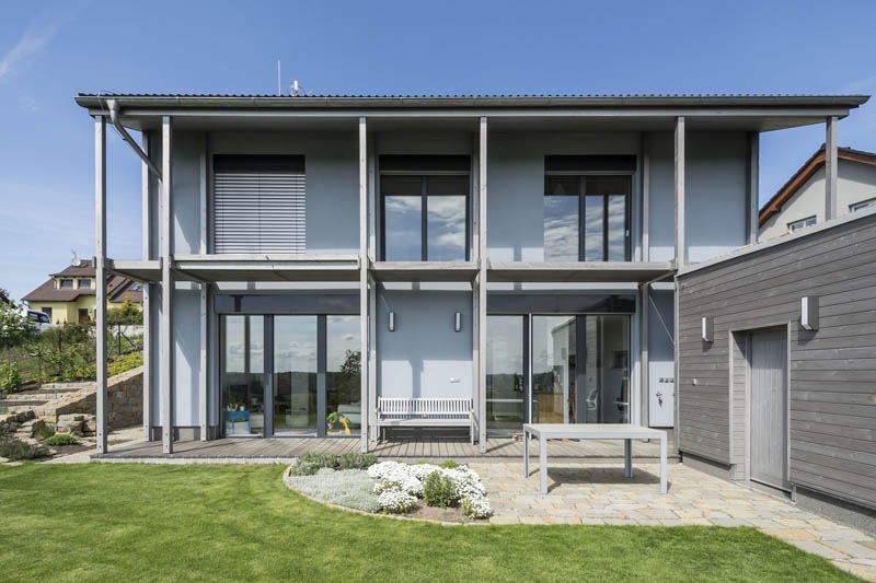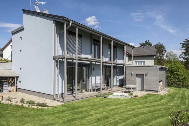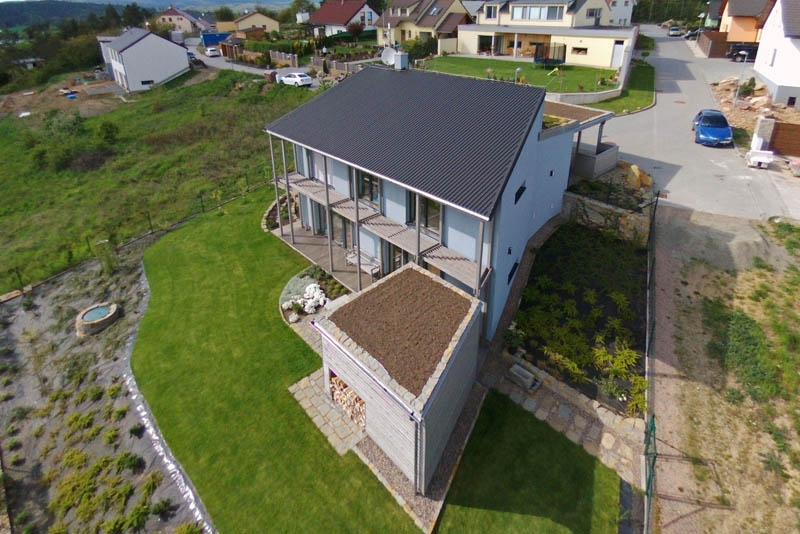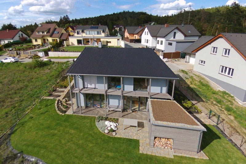 Objekt je řešen jako dvojpodlažní dům v tradiční zděné technologii s pultovou střechou v kombinaci s plochou střechou. Dům je umístěn na svažitém pozemku směrem k jihu. U vstupu na pozemek je krytý přístřešek pro dvě auta s plochou zelenou střechou. U terasy je umístěn sklad-kolna.
